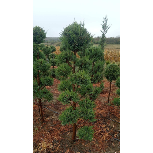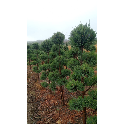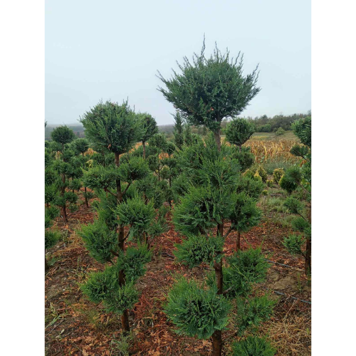 Opis: Cupressocyparis leylandii "Pon Pon" je kompaktna zimzelena četinara sa gustim, pravilno raspoređenim granama i koničnom krošnjom. Njegova posebnost leži u dekorativnom, ručno oblikovanom „Pon Pon“ izgledu, postignutom pažljivim i redovnim orezivanjem. Svetlozelena boja iglica daje vrtu svežinu i eleganciju tokom cele godine, dok njen topijarni oblik unosi notu luksuza u svaki prostor.