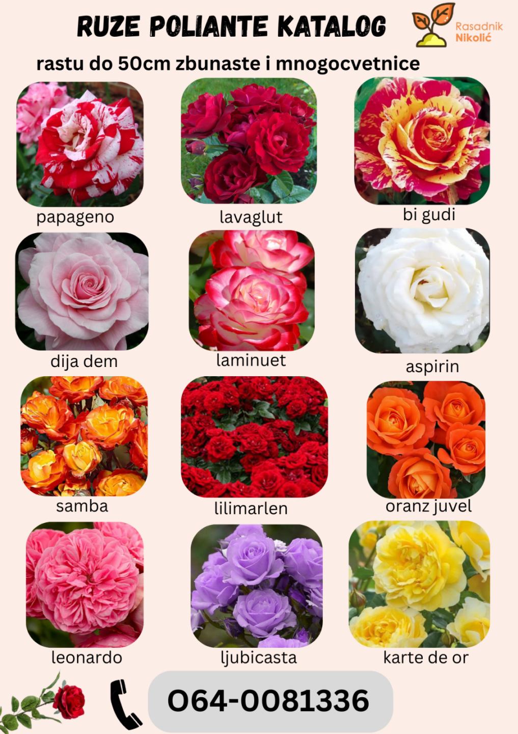 Opis: Ruže polijante su među najpopularnijim vrstama ruža zahvaljujući svom obilnom i neprekidnom cvetanju tokom cele sezone. Ove kompaktne i izuzetno dekorativne ruže formiraju guste žbunove prekrivene mnoštvom sitnih, mirisnih cvetova u različitim bojama. Idealne su za sadnju u baštama, žardinjerama ili kao bordure uz staze i terase.